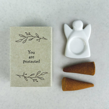 Inside the charming beige matchbox, decorated with elegant botanical illustrations and the comforting phrase “You are protected,” you’ll find a delicate ceramic angel incense holder, along with two Geranium, Orange and Lavender scented incense cones.
