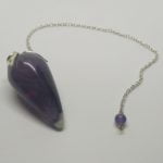 The amethyst lotus pendulum is decorated by a three sided lotus clasp which leads to the holding chain. It weighs 16g.