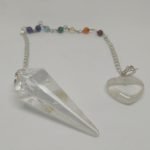 The clear quartz pendulum comes with a decorative chakra chain. The crystals included on the chain are Amethyst, Rose Quartz, Clear Quartz, Green Aventurine, Golden Quartz, Carnelian and Red Jasper.