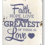 Faith, Hope, Love Distressed Wood Plaque is a 5.75 x 7.75 inch wooden plaque that can be freestanding or hung on a wall. It features the wording ‘Faith, Hope and Love and the greatest of these is Love.’