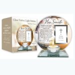 The Glass Plaque/Votive Round Holder His Smile is a silver Effect Tea Light Holder.