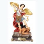 The Saint Michael Statue is full colour in the traditional style with Michael slaying Satan. It is presented on a black base.