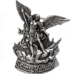 The Saint Michael Visor Clip depicts the classic image of Saint Michael subduing Lucifer. It is a 2.5 inch squared metal plaque. Also, It has a clip on the back so that one can clip it to the sun visor in a car.