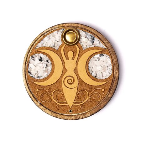 €8.50 €8.50Moon Goddess Incense & Cone Holder Honour the cycles of life and the power of the sacred feminine with this beautifully crafted Moon Goddess Incense & Cone Holder. Designed to hold both incense cones and thinner incense sticks—such as bamboo-based or traditional Japanese varieties—this holder adds spiritual elegance to any altar, meditation space, or sacred corner of your home. At the heart of the design is the Moon Goddess symbol, representing the phases of the moon: waxing, full, and waning. These phases mirror the natural rhythm of life—birth, maturity, and release—making this holder a meaningful tool for ritual and reflection. Decorated with shimmering rainbow moonstone, the piece also carries the calming and intuitive energy of this revered gemstone. Known to enhance inner balance and spiritual insight, rainbow moonstone perfectly complements the goddess motif and invites a deeper connection to your own intuition. Features: - Multi-purpose holder for incense cones and thinner incense sticks