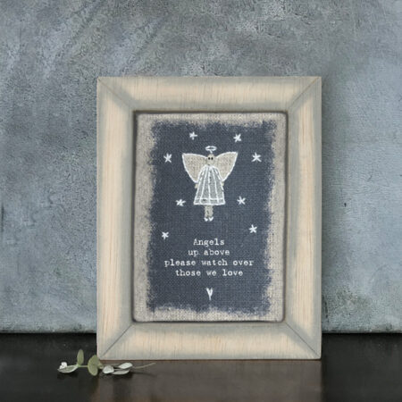 Looking for a meaningful gift to honor someone who’s no longer with us? This beautiful stitched illustration by East of India offers a heartfelt tribute. The embroidered angel, crafted on hessian fabric with delicate stars, carries the touching message: “Angels up above please watch over those we love.” A small embroidered heart adds a sweet, personal touch.