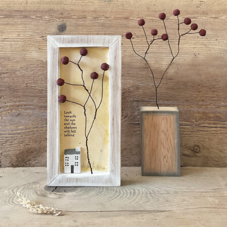 Add a touch of warmth and inspiration to your home with this rustic standing wooden frame, featuring a beautifully crafted wire tree and a mini wooden house. The frame is engraved with the uplifting message: “Look towards the sun and the shadows will fall behind.” A heartwarming reminder that brings positivity to any space.